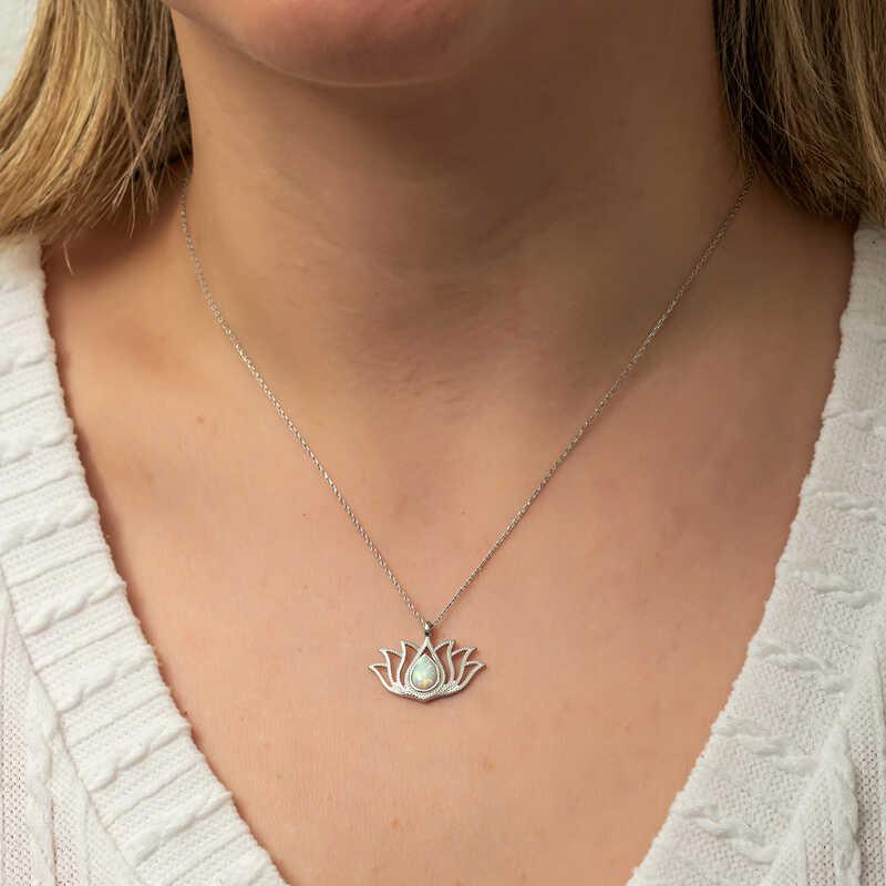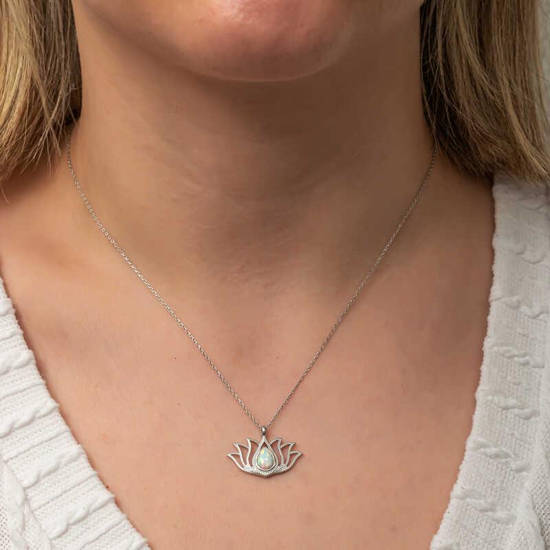 Gümüş Beyaz Opal Taşlı Lotus Kadın Kolye