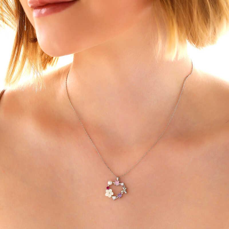 Gümüş Kalp Manolya Çiçeği Kelebek Kadın Kolye