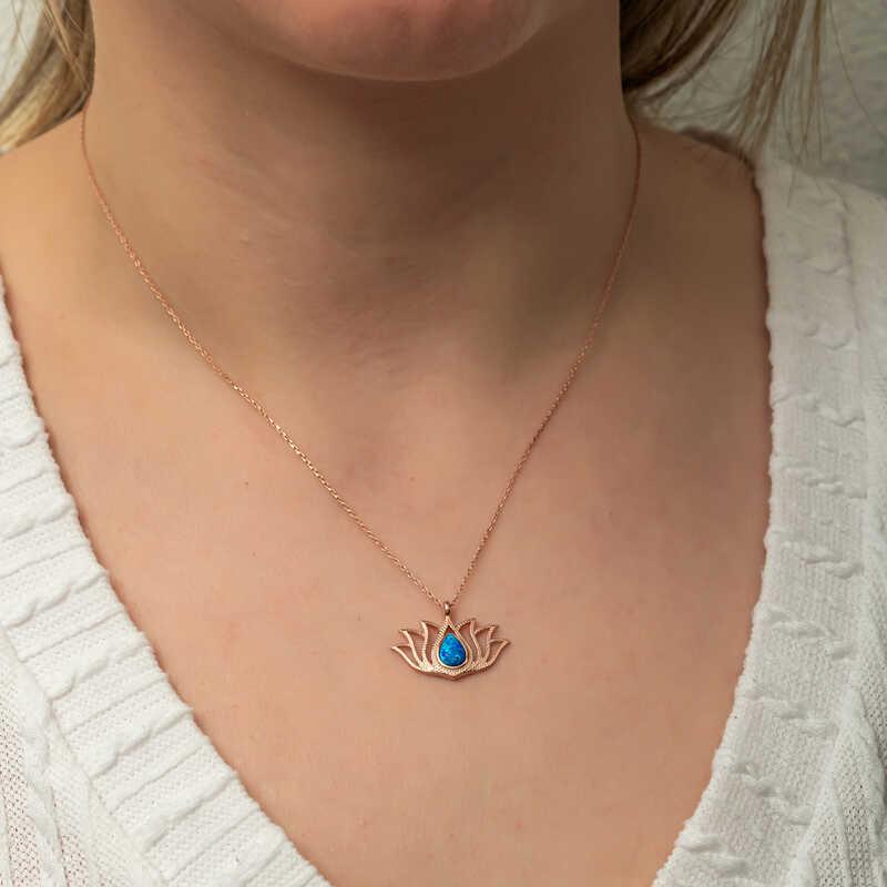 Gümüş Opal Taşlı Rose Lotus Çiçeği Kadın Kolye