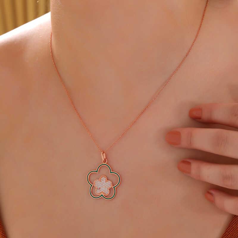 Özel günlerde kadınların tercihleri arasında ilk sıralarda yer alan kolyeler pek çok kadının kurtarıcısıdır. Spor ve klasik her kıyafetle kombinleyebileceğiniz çiçek desenli kolye, çok uygun fiyatla karşınızda. Zarif çiçek motifi üzerine işlenen küçük beyaz zirkon taşlarla desteklenmiş bu modelle şıklığınızı tamamlayabilirsiniz. Bu kolye modeli 925 ayar gümüşten imal edilmiştir. Gümüş üzerine rose kaplama yapılmıştır. Rose kaplama yapılan gümüş kolye modelleri parlaklığını uzun süre muhafaza eder ve oksitlenmesi gecikir. Tüm gümüş kolyelerde olduğu gibi gümüş çiçek desenli kadın kolye modeli de tamamen el emeği ile üretilmiştir. Gümüş ve değerli taşlar nedeniyle belirtilen ortalama ürün ağırlığında ± %10 sapma olabilmektedir.